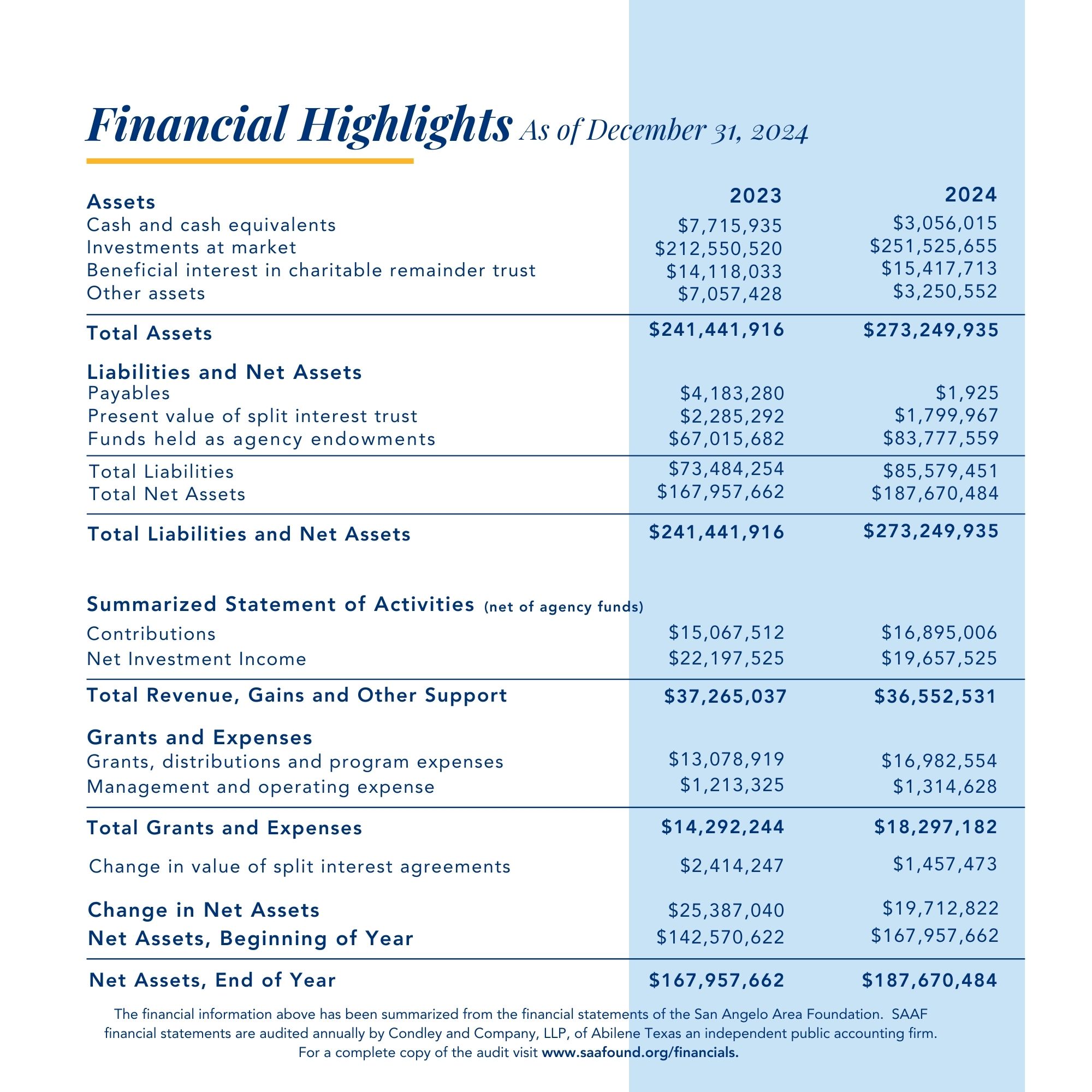 This financial information has been summarized by the Foundation from the financial statments of the San Angelo Area Foundation. The Foundation is audited by the independent public accounting firm of Condley and Company, LLP., of Abilene, Texas. Click here for a copy of the 2024 Audit, which is the most recent completed audit.